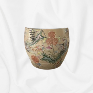 Hand-Painted Oriental-Style Porcelain Planter - A striking, large porcelain planter featuring beautifully detailed hand-painted designs of colorful phoenix birds, chrysanthemums, and lush foliage. The soft cream background provides an elegant contrast to the vibrant greens, oranges, and pinks of the artwork. Perfect for showcasing floral arrangements, as a statement piece indoors, or in a sunroom.